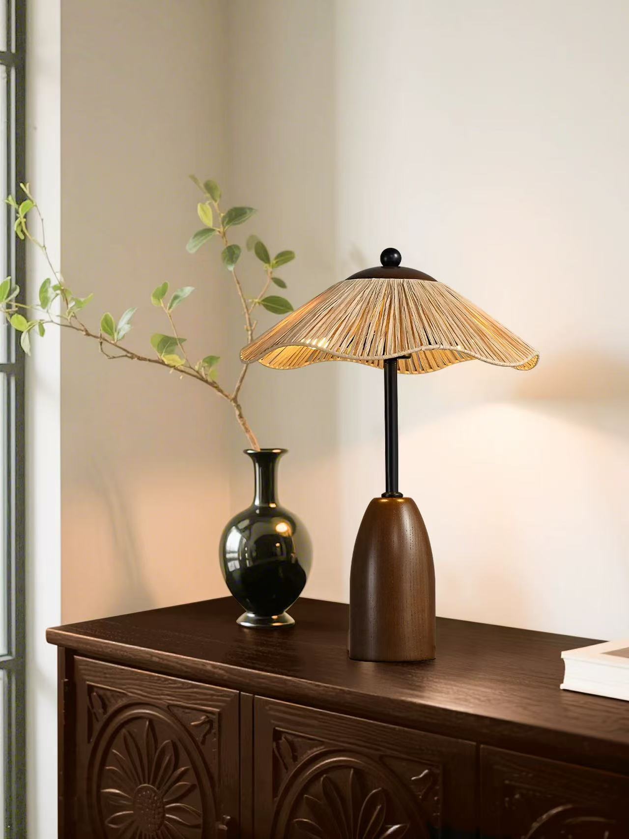 This table lamp is a beautiful addition to any room, crafted with a unique combination of metal, wood, and handwoven straw plaiting. This novel lamp brings a touch of rustic charm to any room, while also offering a sustainable and eco-friendly lighting option. Elevate your interior design with this one-of-a-kind piece.