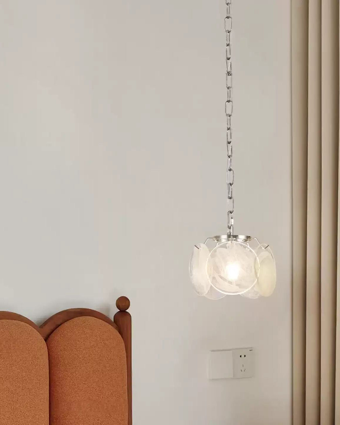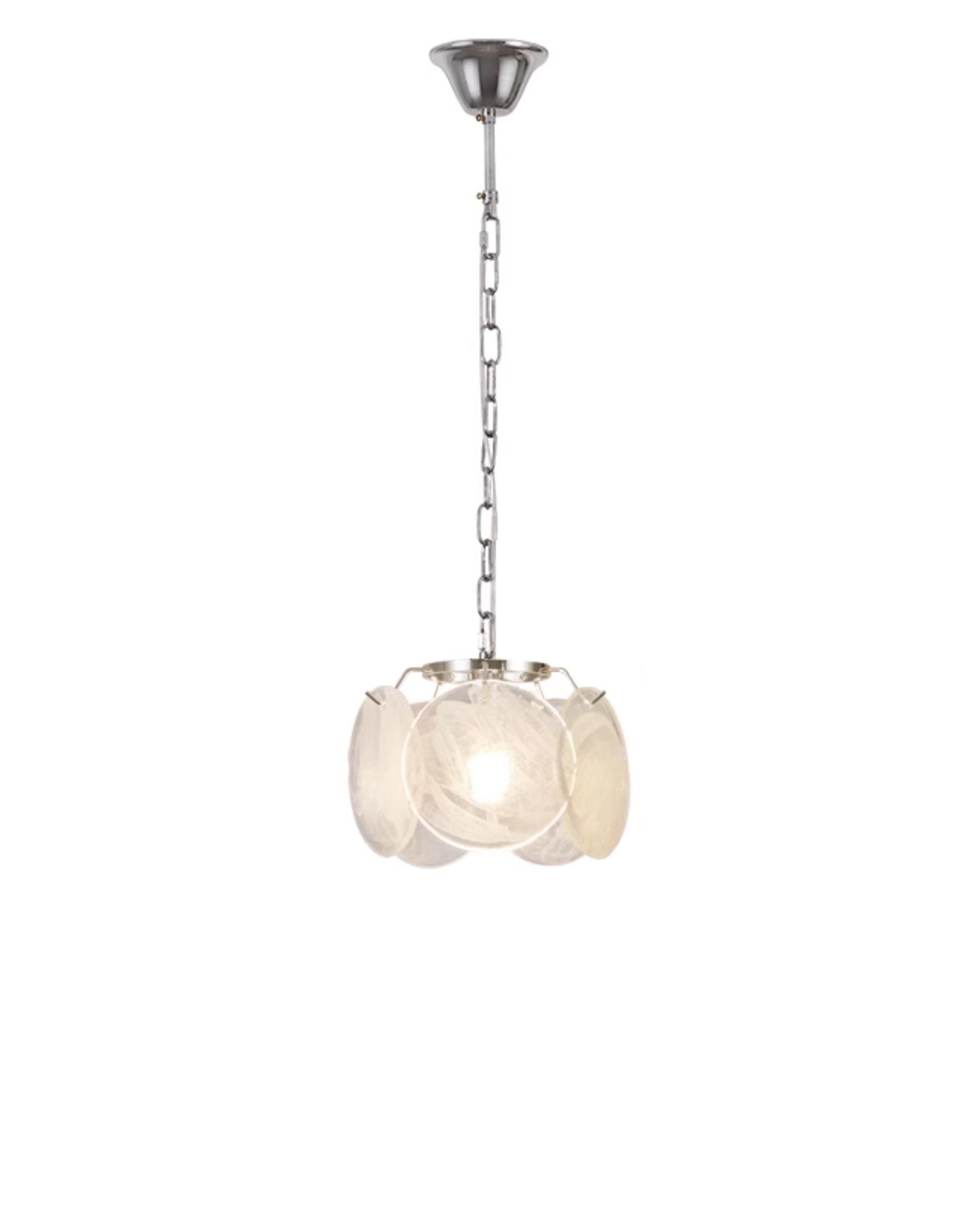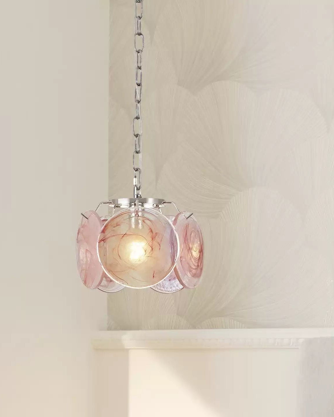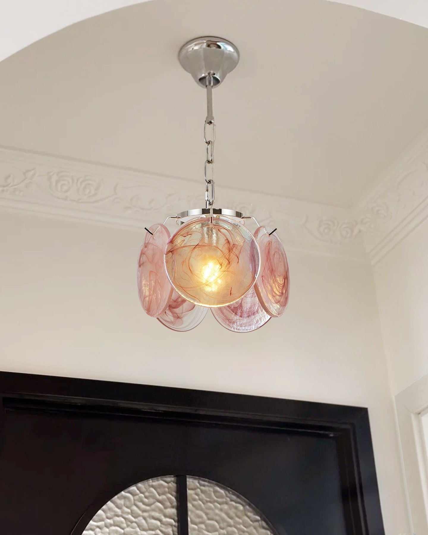 This light features handcrafted glass shades with a circular design and overlaid with colorful, smoky textures, each piece offering a unique view. The crystal-clear glass emits a warm, soft light, creating an elegant visual focal point in any space. Robust and durable metal components ensure its enduring quality and stability. Whether in a dining room, foyer, or a modern interior design seeking sophisticated lighting and timeless charm, this chandelier is perfect for such spaces.